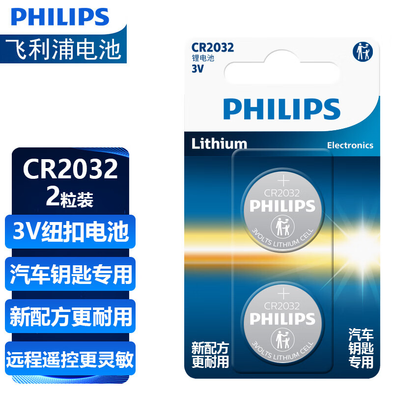飞利浦(PHILIPS)CR2032纽扣电池2粒3V锂电池适用大众奥迪现代汽车钥匙遥控器小米盒子水质测试笔鱼漂电池cr2032